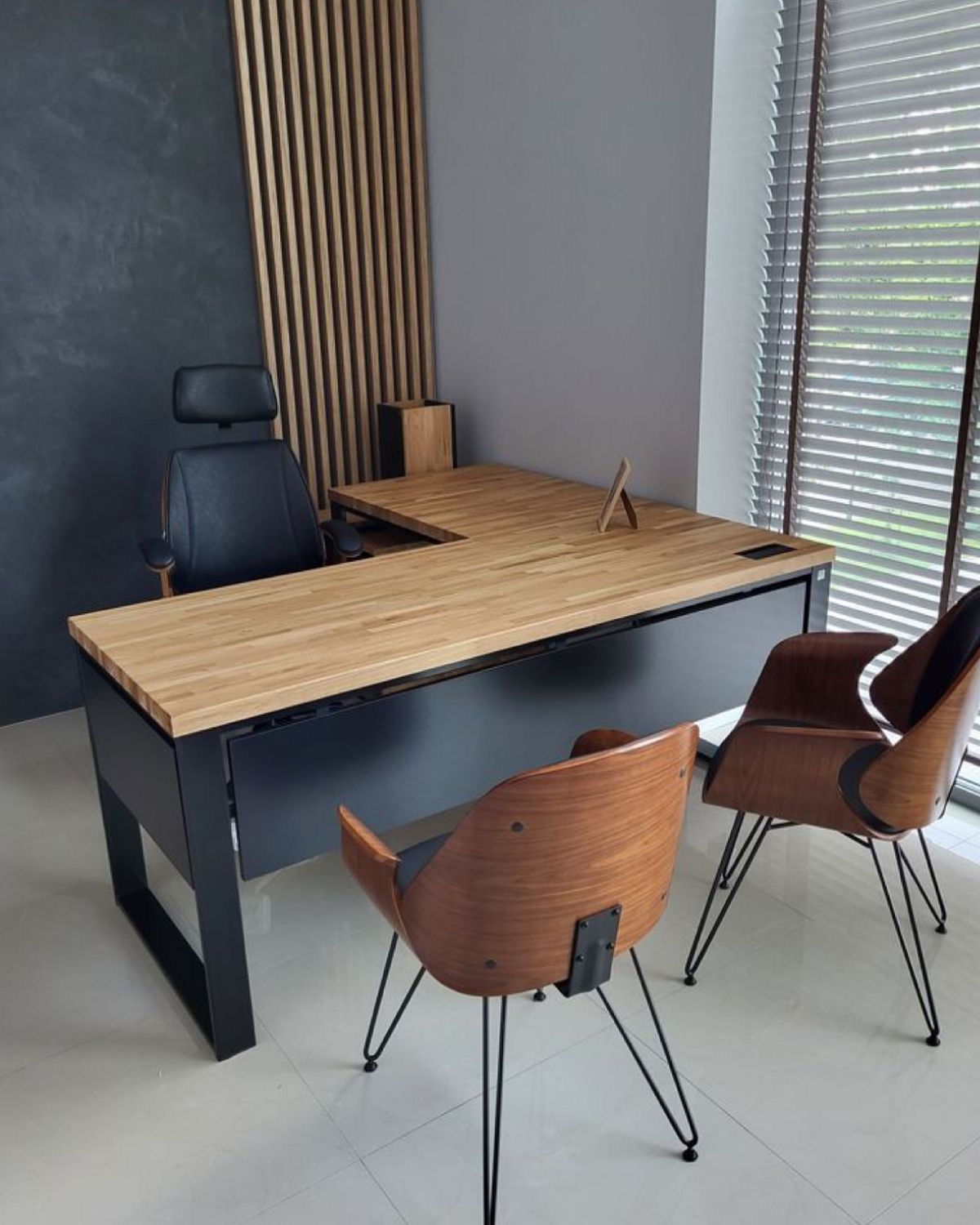 An office cabin table at Desk & Designs is an executive-style desk crafted for private workspaces. It features a spacious surface area and integrated storage options such as drawers and cabinets. Designed with ergonomics and organization in mind, these tables often include cable management systems to keep workspaces neat and comfortable. Our executive desks combine functionality and style, providing a professional environment that enhances productivity and meets modern office needs.